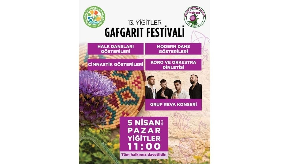 Değirmenlik Akıncılar Belediyesi ve YİĞİT-DER iş birliğiyle düzenlenen 13'üncü Yiğitler Gafgarıt Festivali, 5 Nisan Pazar günü Yiğitler 16 Ağustos Özgürlük Parkı’nda Hüseyin Kıral’ın sunumuyla başlayacak. Festival kapsamında dans gösterileri, müzik dinletileri, yarışmalar ve Grup Reva konseriyle gerçekleşecek.